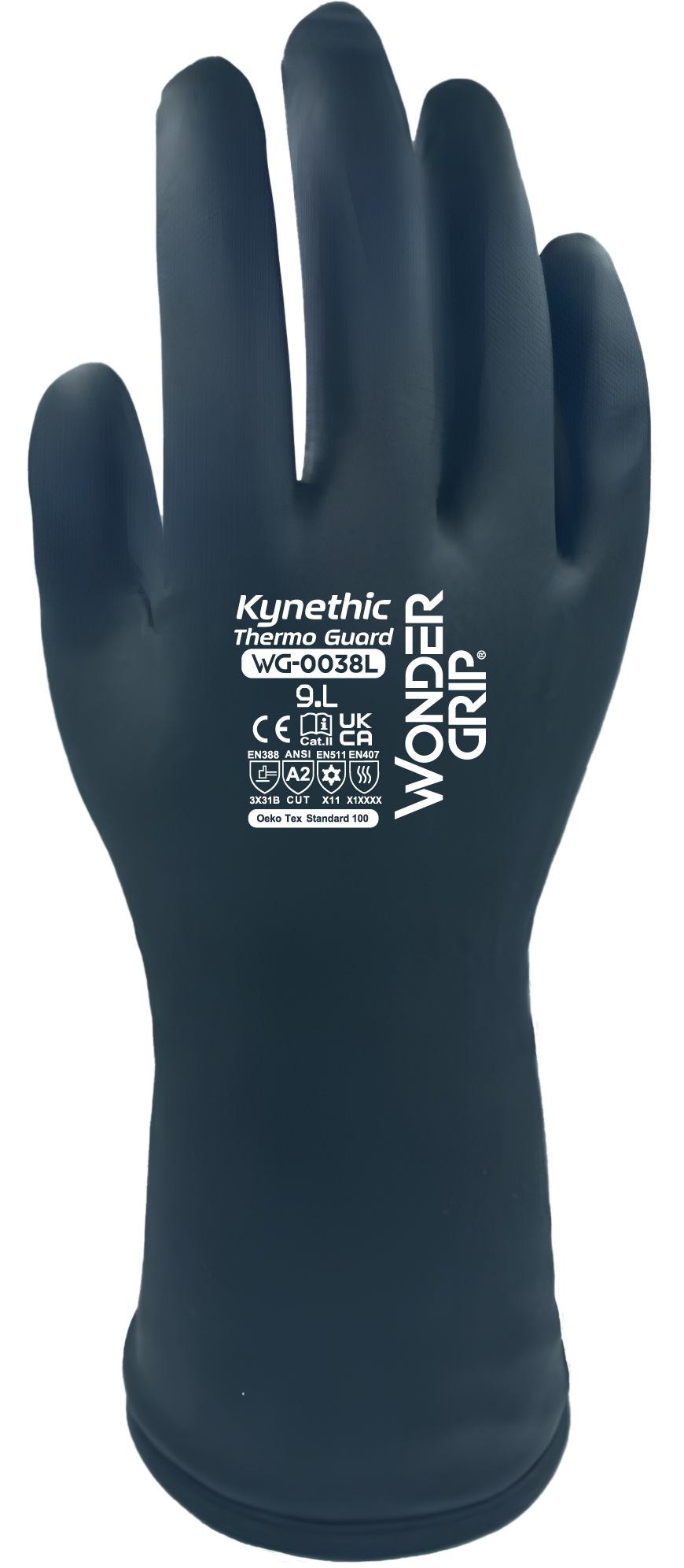 Der Wonder Grip® WG-0038L Kynethic Thermo Guard ist für nasse, ölige und kalte Umgebungen entwickelt. Als Thermohandschuh mit 30 cm langer Stulpe bietet er zuverlässigen Flüssigkeitsschutz, Isolierung und Atmungsaktivität bei guter Beweglichkeit. Die Kälteresistenz nach EN 511 sichert konstante Leistung bei niedrigen Temperaturen. Die Wonder Grip Absolute™-Beschichtung entsteht in einem patentierten, gerinnungsmittelfreien Verfahren ohne DMF und Methanol, reduziert VOC-Emissionen und unterstützt nachhaltige Produktion. Der nanotechnologisch gefertigte PU-Film sorgt für sicheren Halt in nassen und öligen Bedingungen, bleibt leicht, flexibel und atmungsaktiv. Das angeraute Acryl-Innenfutter sorgt für Wärme, Flexibilität und präzises Handling in anspruchsvollen Umgebungen.
