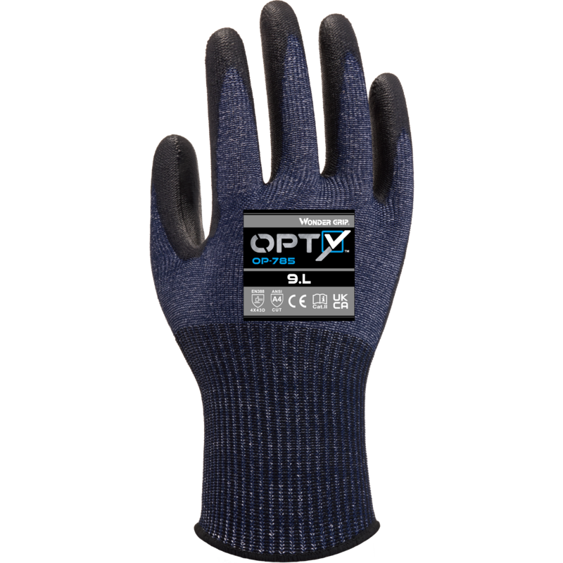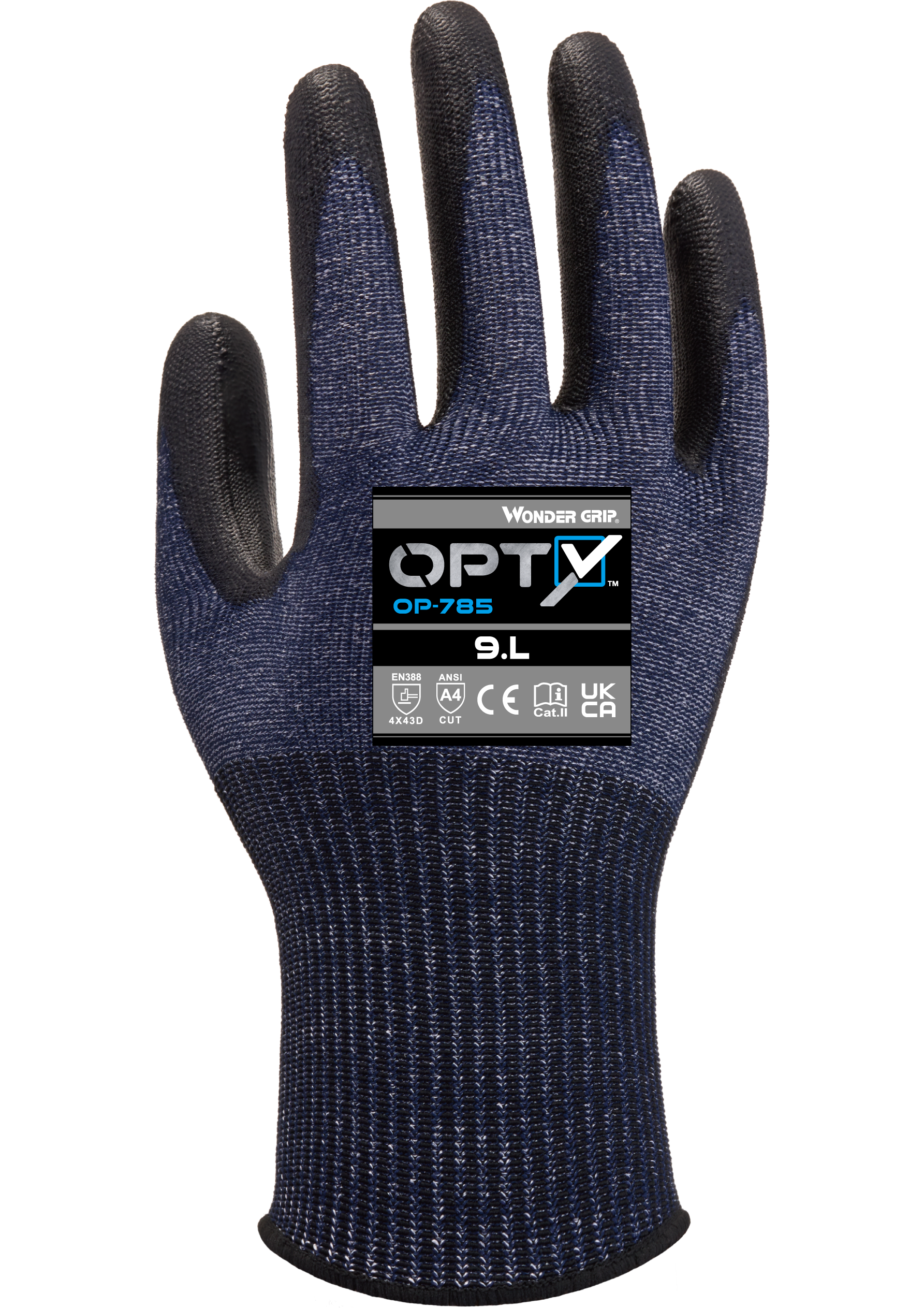Der Wonder Grip® OP-785 Opty™ ist für Arbeiten mit mittlerem bis hohem Schnittrisiko konzipiert (ISO 13997 Stufe D und ANSI A4) und bietet dabei ein außergewöhnliches Maß an Komfort und Fingerfertigkeit.