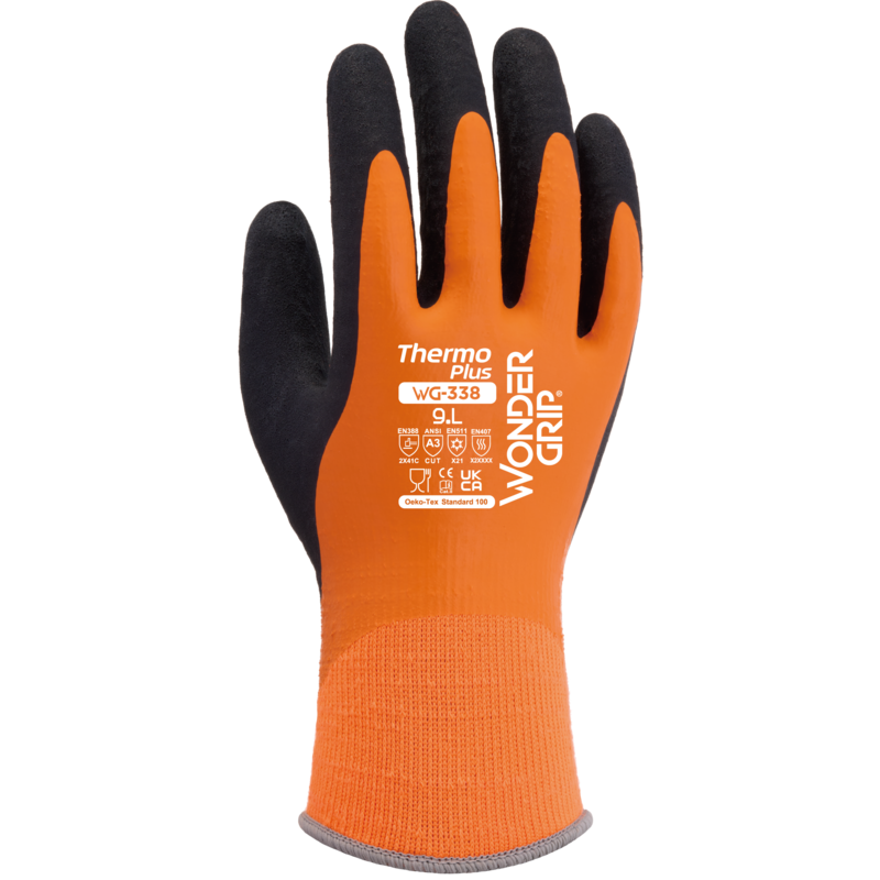 Der Wonder Grip® WG-338 Thermo Plus ist ein vollständig doppelt latexbeschichteter Handschuh auf einem 13-Gauge-Acrylträger.