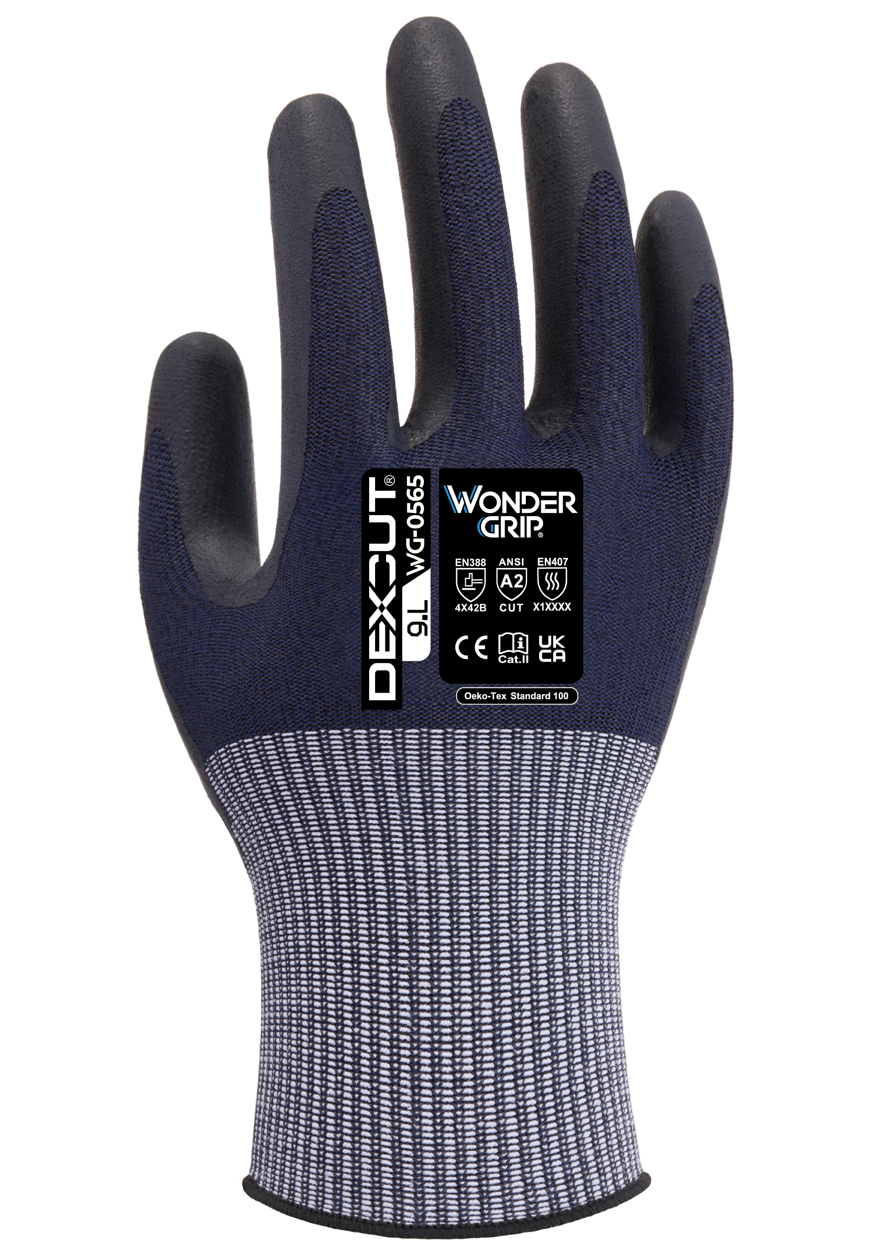 The Wonder Grip® WG-0565 Dexcut® is a 15-gauge glove offering ISO 13997 level B and ANSI/ISEA 105 level A2 cut protection. Its fibreglass-free liner, made from HPPE Tsunooga™ fibre, combines tensile strength, durability, and lightweight comfort for extended wear. Featuring the eco-friendly Wonder Grip Nereus™ nitrile coating, produced with a water-based process, it eliminates harmful solvents, reduces VOC emissions, and minimises waste through controlled dipping. The thin, smooth coating ensures excellent breathability while delivering a secure grip in dry conditions. The WG-0565 reflects Wonder Grip®’s commitment to sustainability, combining eco-conscious manufacturing with reliable, long-lasting performance.