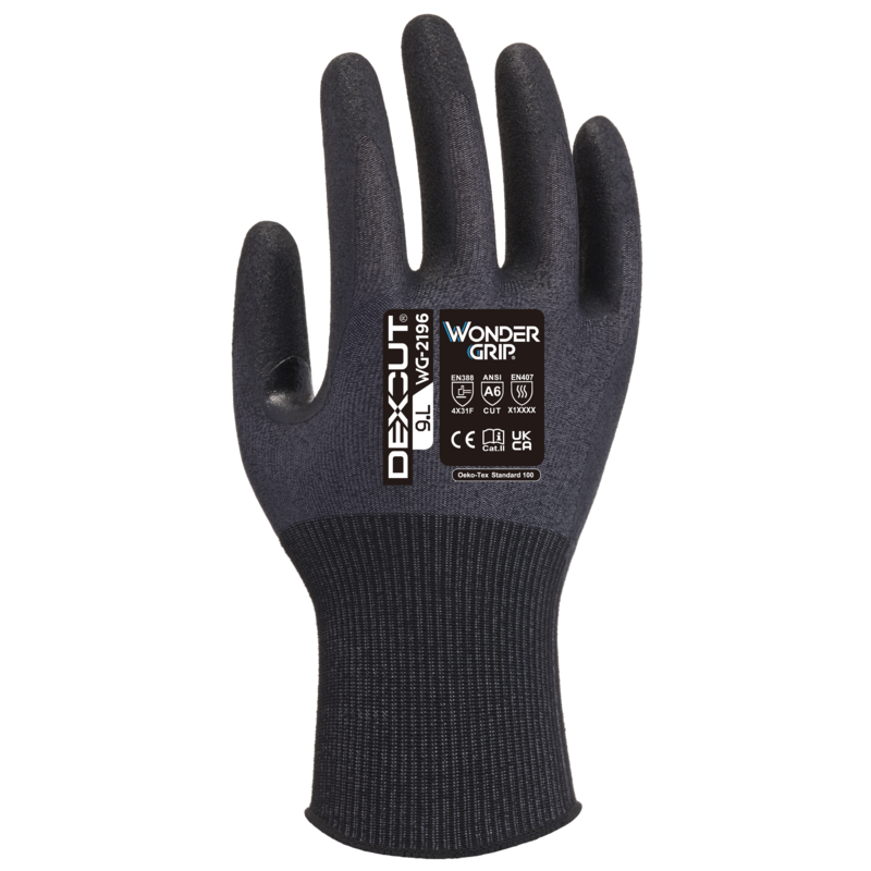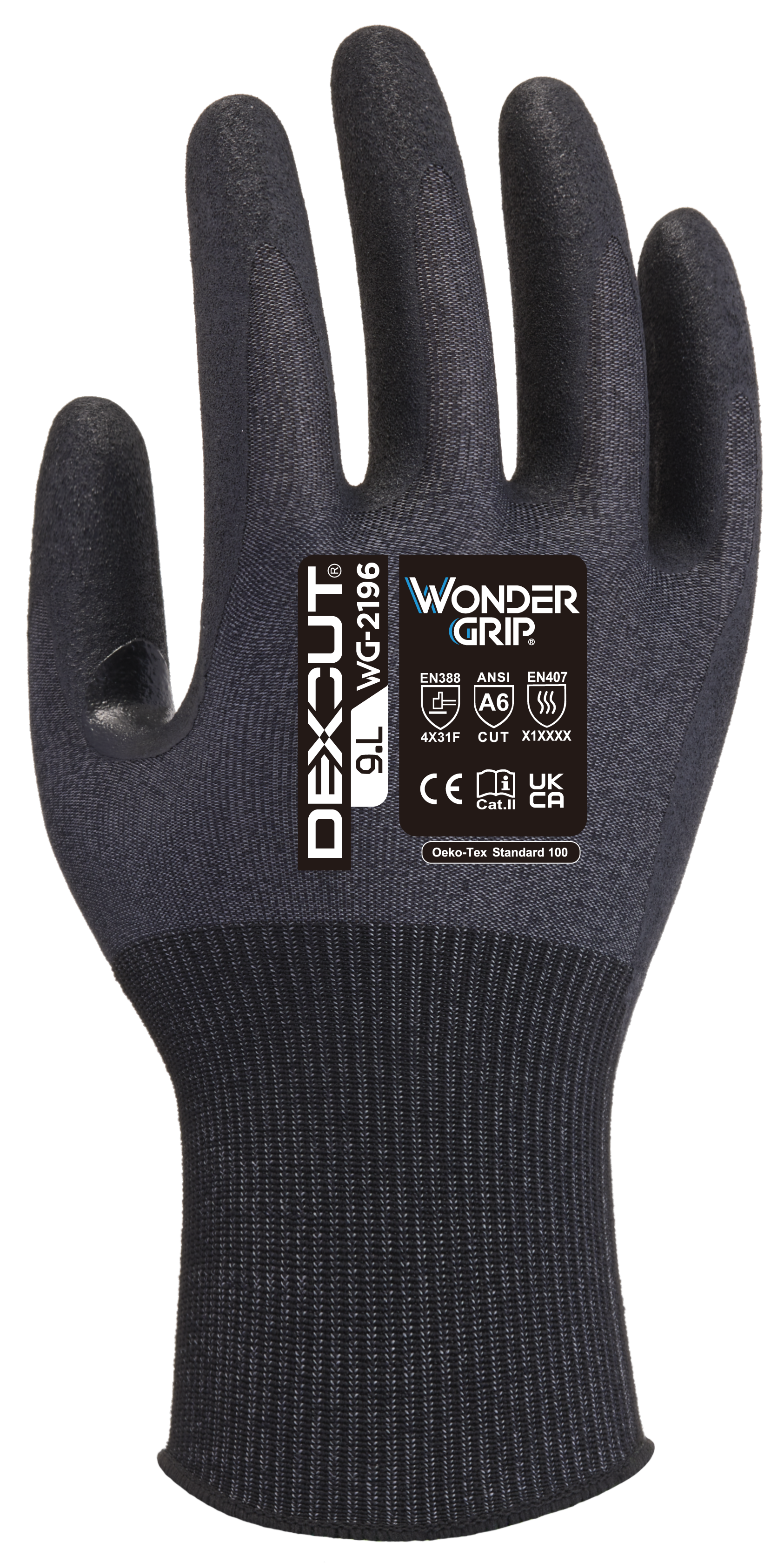 The Wonder Grip® WG-2196 DEXCUT® 21G | Twenty-one series is a glass-fibre-free glove developed with the same R&D principles as our 21-gauge range, offering bare-hand tactility, ergonomic fit, and outstanding suppleness with extreme cut protection. Certified to ISO 13997 level F and ANSI/ISEA 105 level A6, it ensures maximum safety in high-risk tasks. Its ultra-lightweight seamless liner, engineered from premium technical fibres, delivers durability, skin-friendliness, and long-term comfort. Enhanced with Wonder Grip Technology™ nitrile coating and TPDT™ pre-curved ergonomic moulding, the WG-2196 provides a secure, controlled grip in dry and oily conditions, making it a premium solution for precision handling.