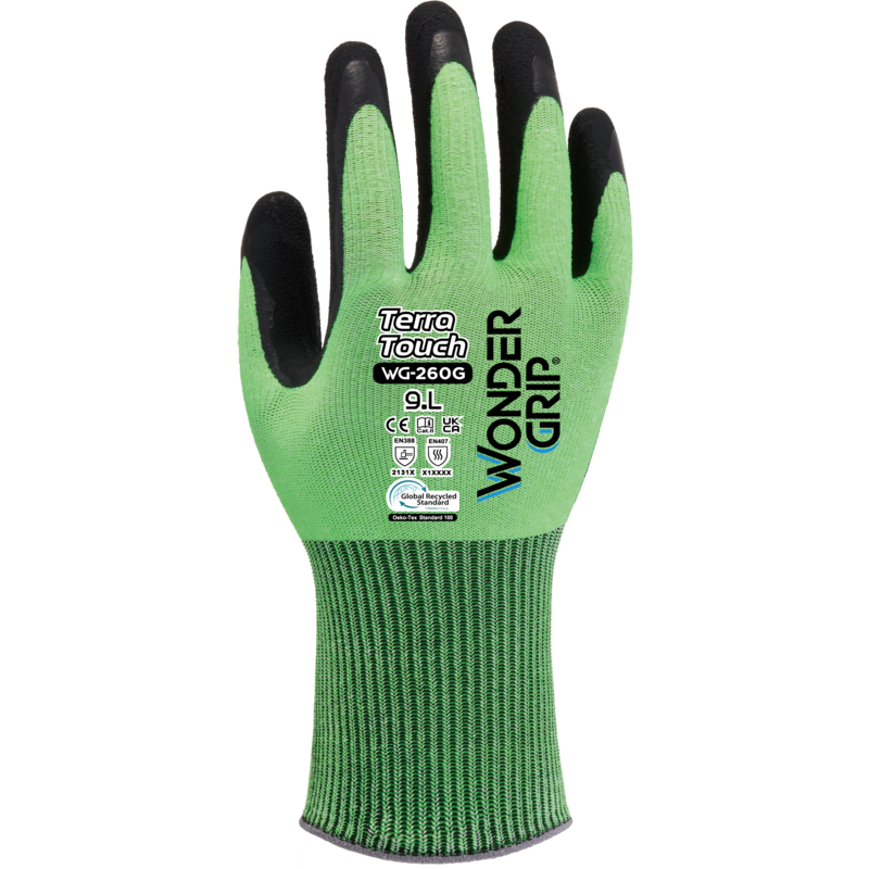 The Wonder Grip® WG-260G Terra Touch is meticulously crafted from 46% superior recyclable polyester, delivering optimal comfort, secure and fit. Endorsed by Global Recycled Standard, each pair of the WG-260G embodies sustainability, repurposing the equivalent of 2 PET bottles. By choosing the WG-260 Terra Touch, you are investing in premium hand protection and a more sustainable future. Quality, safety and sustainability, literally at your fingertips: make a difference, one glove at a time.