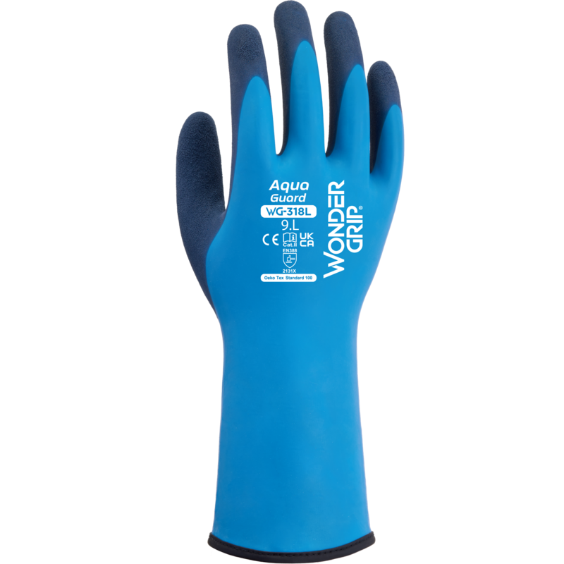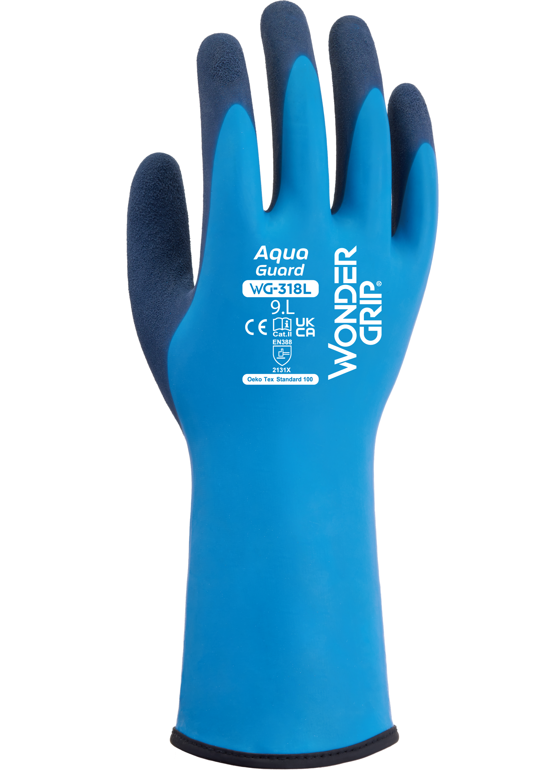 The Wonder Grip® WG-318L Aqua Guard is a meticulously engineered 30cm long, double latex coated constructed on an 18-gauge smooth liner, enhancing comfort and reducing hand fatigue. The unique Wonder Grip Technology™ coating provides unmatched grip and durability, whether in dry or wet conditions. 100% waterproof, it ensures that the wearer's hands stay dry and comfortable, even during extended periods of use. The Wonder Grip® WG-318L Aqua Guard stands out as our top pick for grip and flexibility in wet conditions, assuring optimal comfort while ensuring unhindered hand movement.