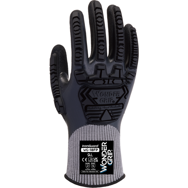 Wonder Grip® WG-18FP IronGuard on kaksinkertainen täysin pinnoitettu nitriilikäsine, joka on valmistettu neuletiheydeltään 15 g:n nailonvuorin päälle. Wonder Grip Technology™ -teknologian ansiosta pinnoitteessa on poikkeuksellinen pito ja kestävyys kuivissa tai märissä ympäristöissä. Tämä kaksinkertainen nitriilipinnoite yhdistettynä Wonder Grip Technology™ -teknologiaan takaa erinomaisen suojan, kun käyttäjä työskentelee märkien, rasvaisten tai öljyisten elementtien kanssa. Wonder Grip® WG-18FP -käsineen kämmenselkä on varustettu termoplastisella (TPR) kumivahvisteella, joka suojaa rystysiä ja kämmenselkää. Samalla se tarjoaa mukavuuden, liikkumisvapauden ja jatkuvan pidon, joka on ansainnut Wonder Grip®:n kansainvälisen maineen.