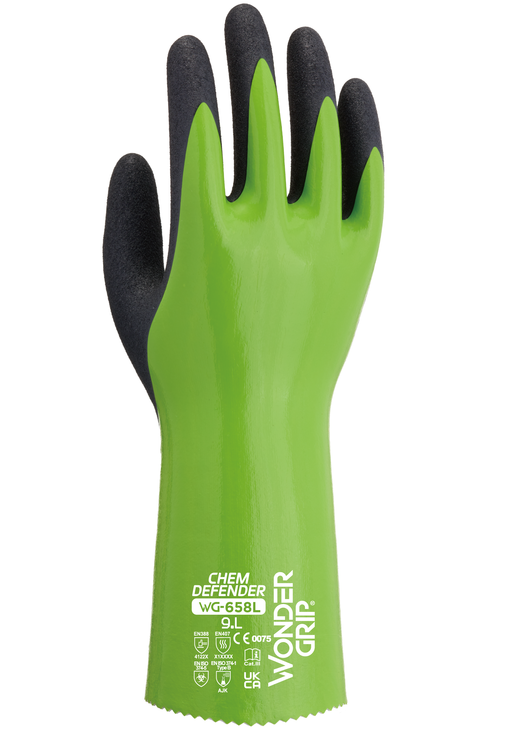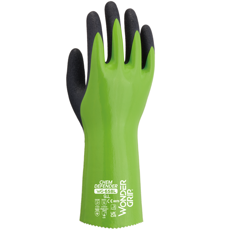 Le WG-658L Chem-Defender est notre nouveau gant résistant aux risques chimiques dans les environnements secs, huileux ou humides avec une triple enduction en nitrile. La Wonder Grip Technology™ sur la paume combinée avec notre technologie TPDT™ (Thermo-set Pre -Curved Design Technology™) qui respecte la forme naturelle de la main offre d'excellentes performances ergonomiques et une adhérence inégalée dans les environnements glissants.