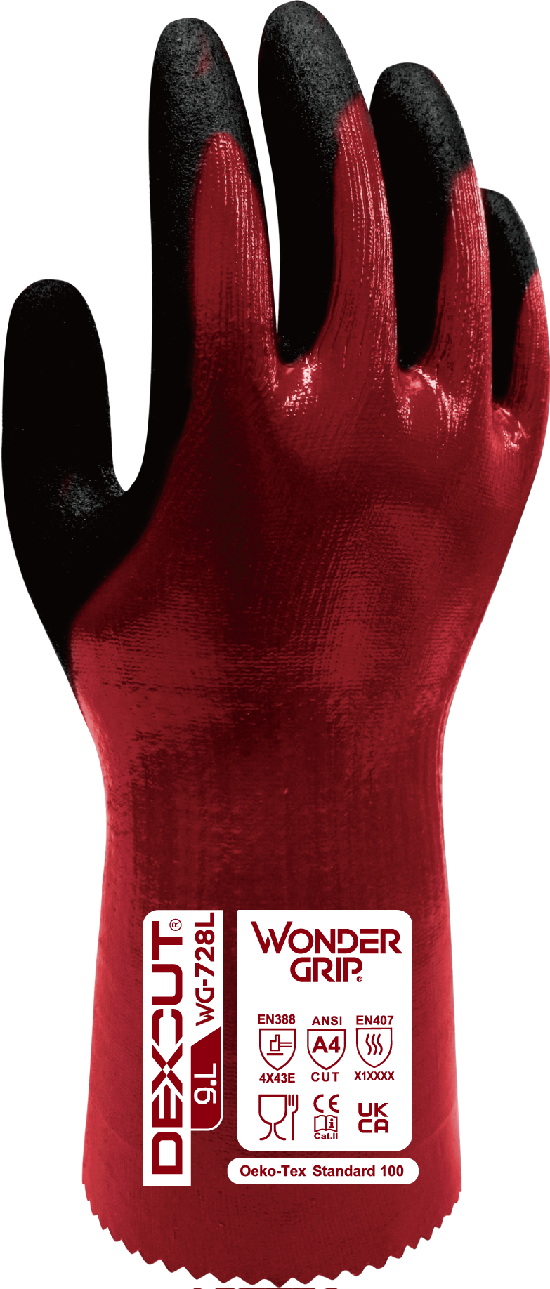 Le WG-728L Dexcut® présente une triple enduction nitrile complète sur notre support Dexcut, jauge 15, en polyéthylène haute performance TsunoogaTM, fibre minérale et élasthanne. Le WG-728L Dexcut® allie une protection anti-coupure très élevée, niveau E (ISO 13997) avec des propriétés exceptionnelles de résistance à l’abrasion, ainsi qu’une imperméabilité totale aux huiles industrielles et liquides.