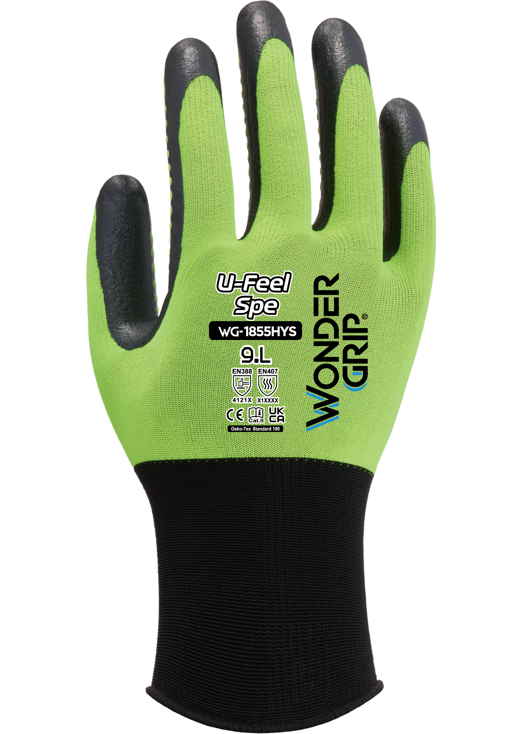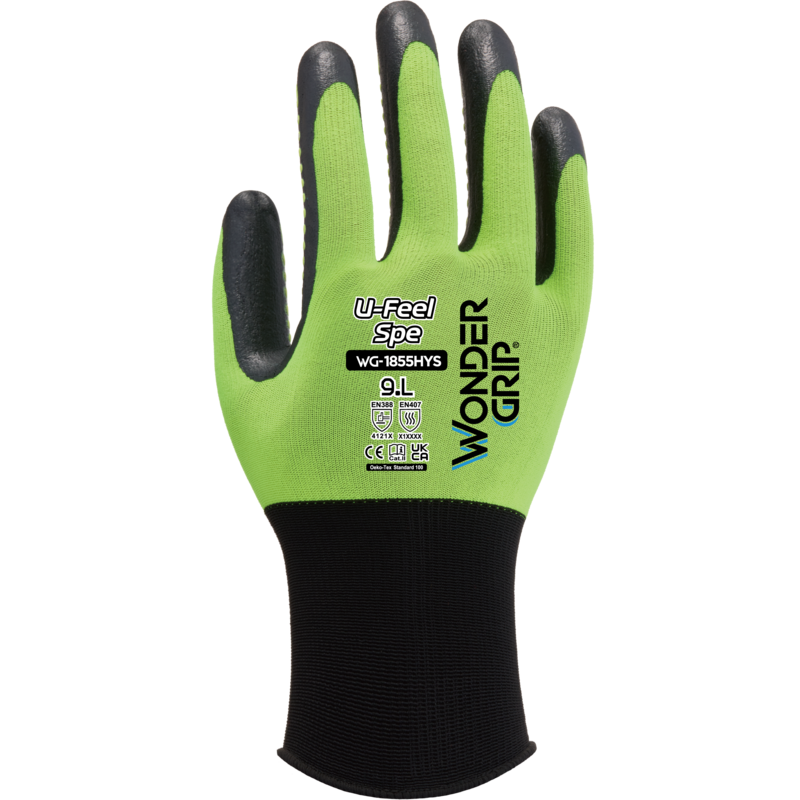 Wonder Grip® WG-1855HYS U-Feel Spe は、18 ゲージのポリエステルとスパンデックスのライナー上に単一のニトリルコーティングが施された手袋です。当社の Wonder Grip Performance™ ディッピングは、卓越した薄く滑らかな保護コーティングを提供し、指先に比類のないレベルの感度と器用さを提供します。信じられないほど薄くて柔らかいので、ユーザーに第二の皮膚のような感覚を与え、並外れたレベルの快適さと精密な作業に理想的なグローブを提供します。手のひら部分に独自のマイクロドットを採用し、耐摩耗性とグリップ性能を強化しました。