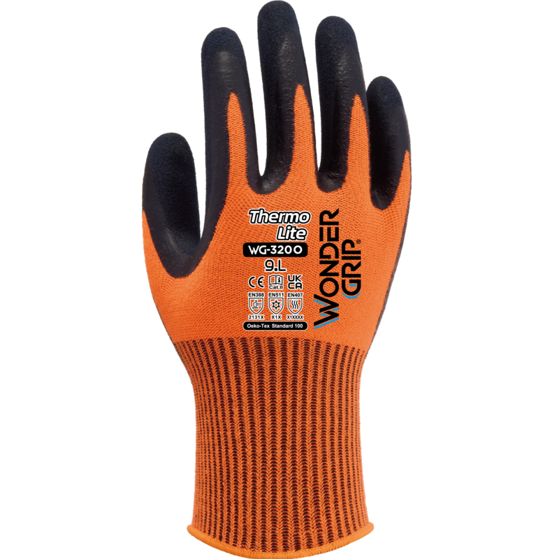 ワンダーグリップ® WG-320O サーモライトは、13 ゲージのブラッシュアクリルとスパンデックスのライナーで構成された二重ラテックスコーティング手袋です。アクリルは防寒のためのさらなる断熱性を提供し、スパンデックスは柔軟性、フィット感、快適性の維持に役立ちます。