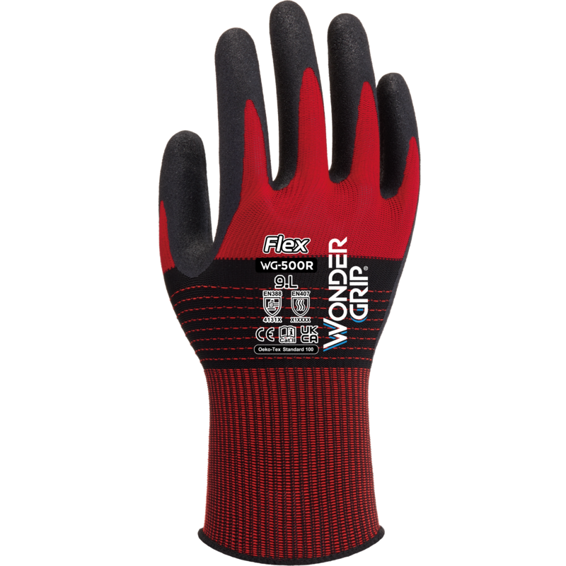 WG-500R フレックスは、13 ゲージのポリエステル繊維にニトリルシングルコーティングを施した手袋です。Wonder Grip Technology™ により、部品の組み立て作業や倉庫作業などで優れたグリップ力と快適さをもたらします。 WG-500R フレックスは、乾燥した環境はもちろん、濡れた状態、わずかに油を伴う環境でも優れた性能を発揮する汎用的な手袋として最適です。