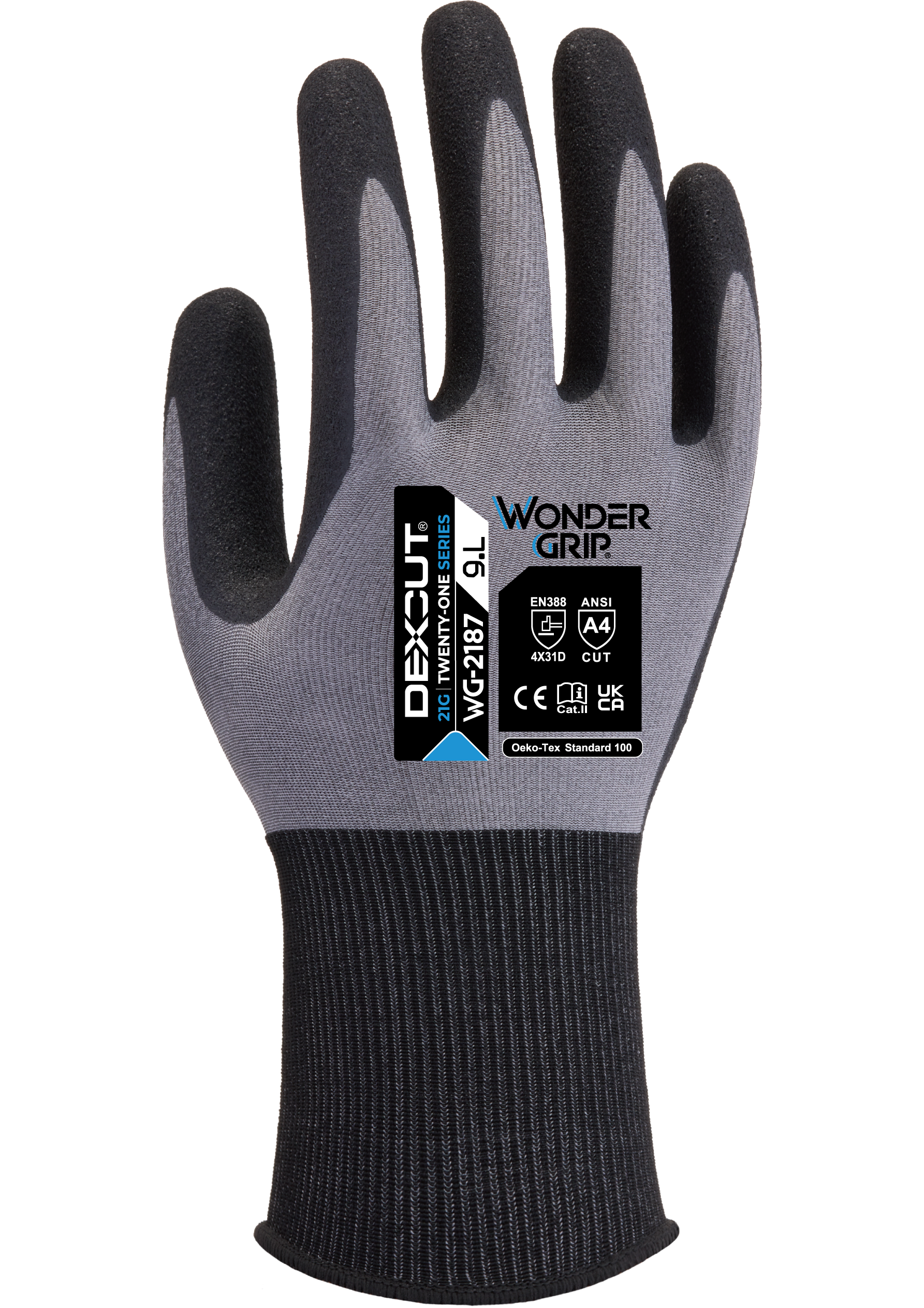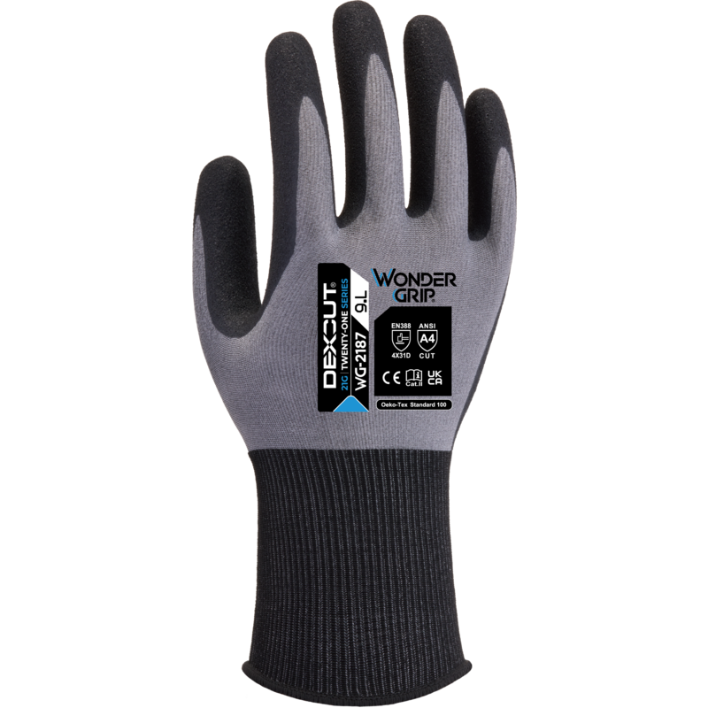 De Wonder Grip® WG-2187 DEXCUT® 21G | 'Eenentwintig series' bieden uitzonderlijke snijbescherming, met ISO 13997 niveau D en ANSI snijniveau 4, terwijl ze ongeëvenaarde vingergevoeligheid en soepelheid bieden. Deze handschoen, afkomstig uit de DEXCUT®-lijn, bekend om zijn ultramoderne snijbestendige composietgarens, is voorzien van een ultralichte 21-gauge naadloze voering die u een ervaring biedt die het werken met blote handen het dichtste benadert, zonder dat dit ten koste gaat van de bescherming. De Wonder Grip Technology™ nitrilcoating, gecombineerd met onze TPDT™ technologie (Thermo-set Pre-Curved Design Technology™), maakt de Wonder Grip® WG-2187 DEXCUT® 21G | Eenentwintig-serie de perfecte oplossing voor ongeëvenaarde ergonomische prestaties en ongeëvenaarde grip in droge, licht vochtige of olieachtige omstandigheden.