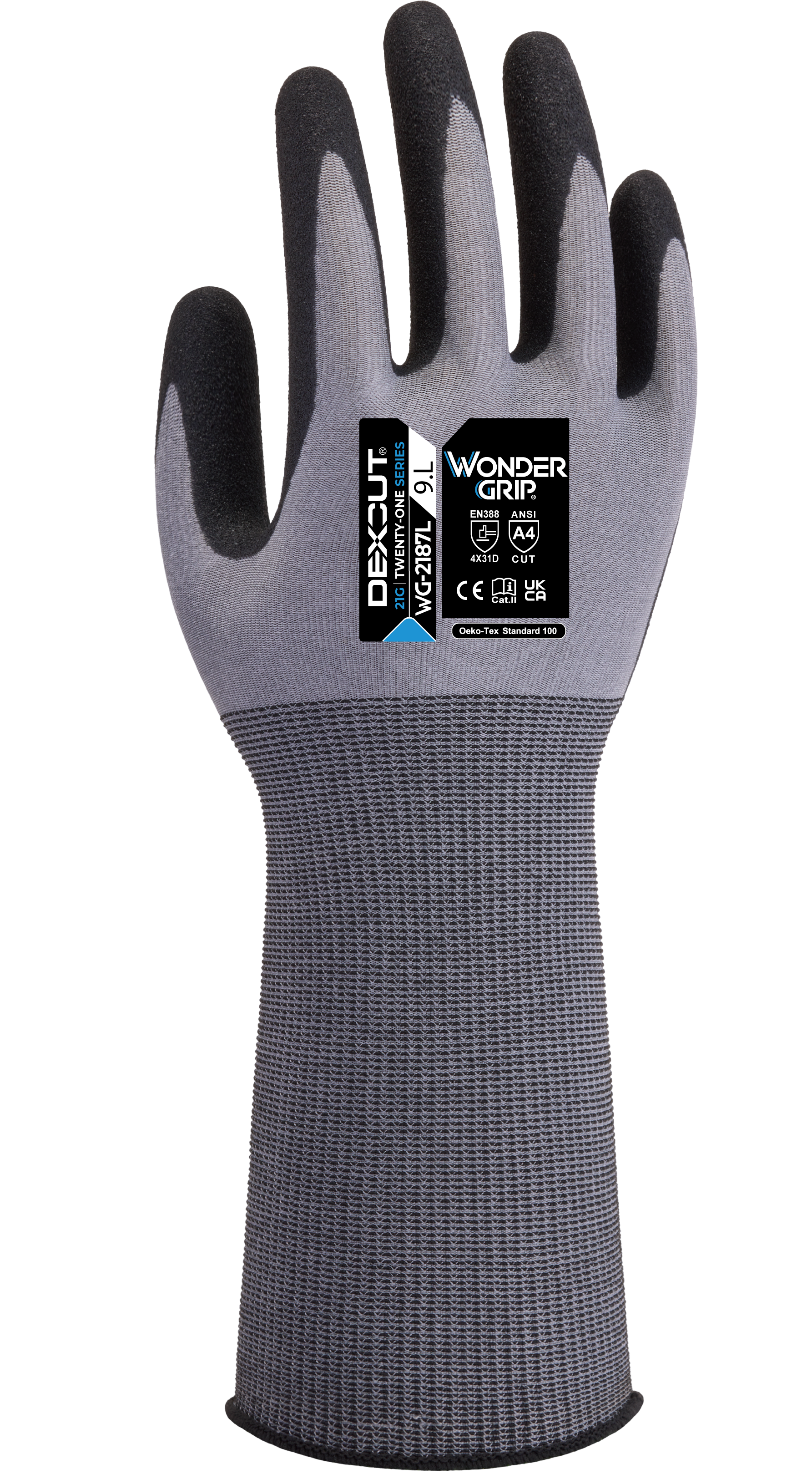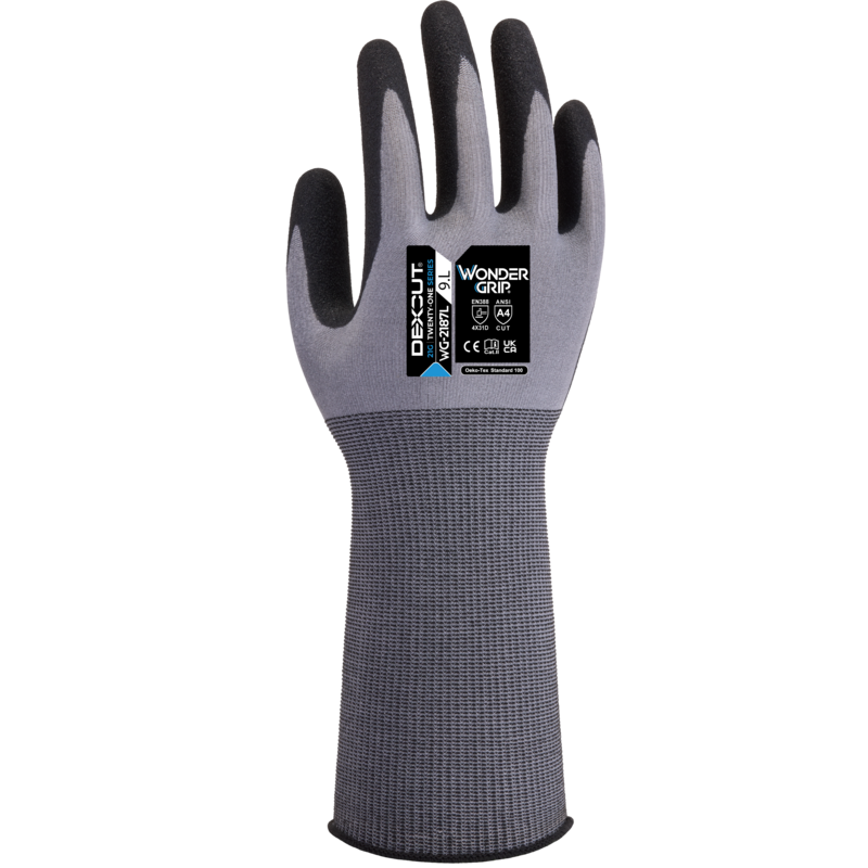 De Wonder Grip® WG-2187L DEXCUT® 21G | Twenty-one serie is een glasvezelvrije handschoen die snijbescherming biedt volgens ISO 13997 niveau D en ANSI/ISEA 105 niveau A4, met behoud van uitzonderlijke vingergevoeligheid en soepelheid. Met een lengte van 30 cm biedt de handschoen een betere bescherming voor de arm zonder in te boeten aan flexibiliteit of ademend vermogen. Gemaakt van ultralichte 21-gauge snijbestendige composietgarens, biedt de handschoen het gevoel alsof u met een blote hand werkt, maar met maximale veiligheid. Versterkt door de Wonder Grip Technology™ nitrilcoating en het voorgevormde ergonomische TPDT™-ontwerp, garandeert de WG-2187L superieur comfort, precisie en grip in droge, licht vochtige of olieachtige omgevingen.