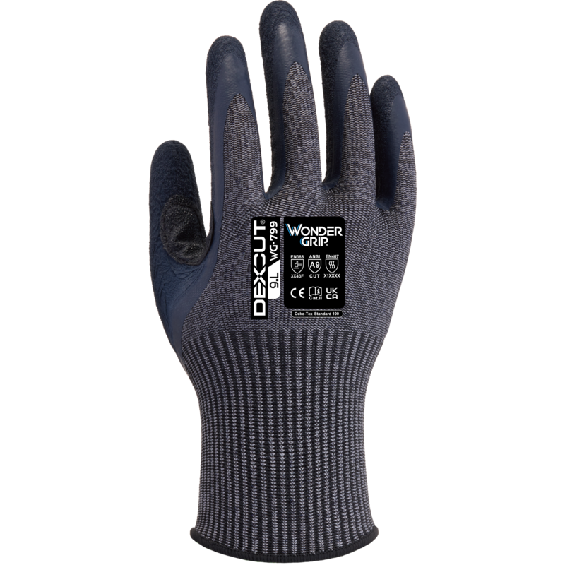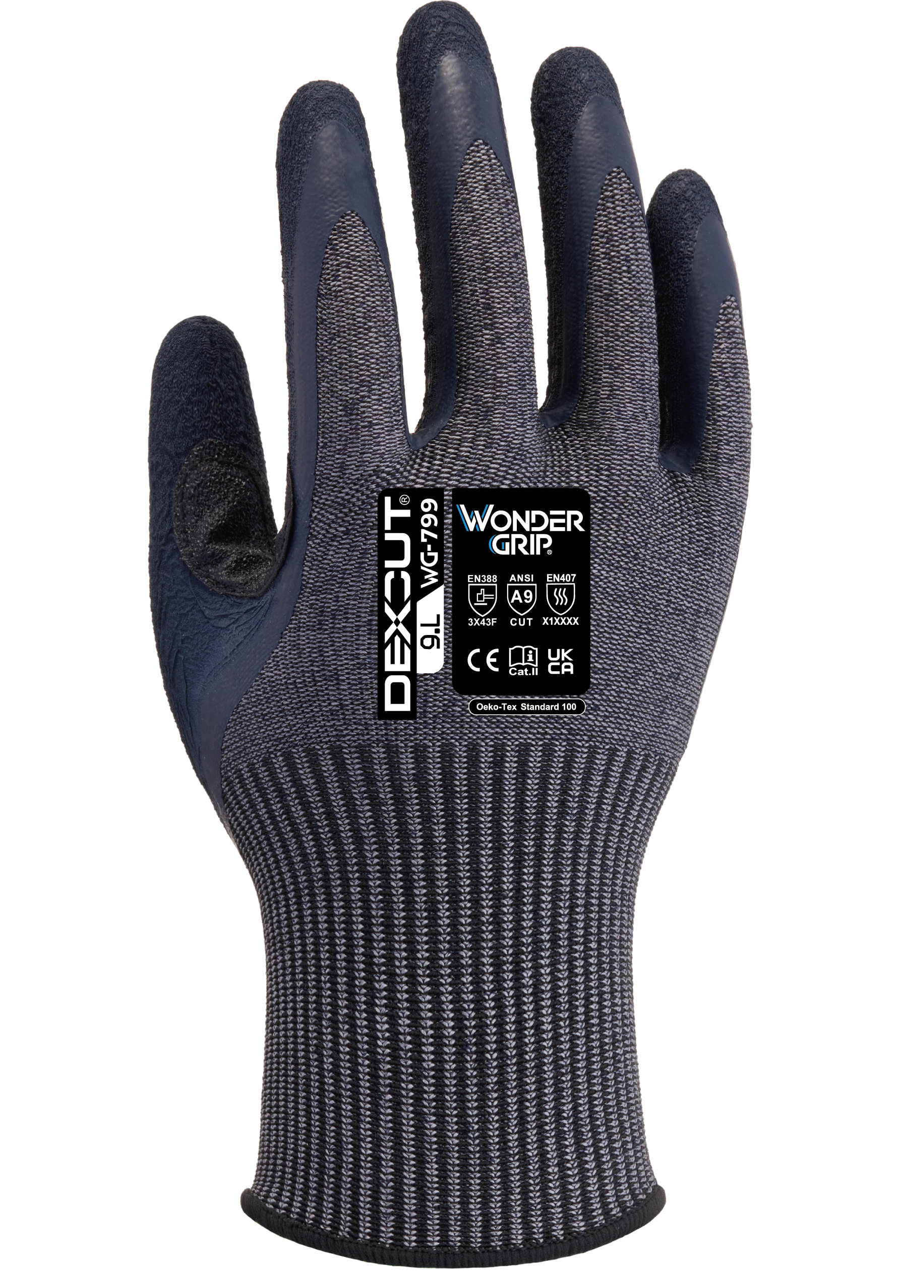 De Wonder Grip® WG-799 DEXCUT® is een glasvezelvrije handschoen, ontwikkeld met geavanceerde, snijbestendige vezels. Deze handschoen biedt maximale bescherming met ISO 13997 niveau F en ANSI/ISEA 105 niveau A9-certificering. Ontworpen voor bescherming tegen extreme snijrisico's, is deze handschoen ideaal voor de zwaarste industriële toepassingen. De WG-799 combineert veiligheid met bewegingsvrijheid en heeft een robuust, ergonomisch ontwerp dat vermoeidheid vermindert en langdurig comfort garandeert. De duurzame coating biedt een veilige, betrouwbare grip in droge en licht vochtige omgevingen. De WG-799 onderscheidt zich in zijn klasse en is de ultieme oplossing voor risicovolle, zware taken waarbij veiligheid cruciaal is.
