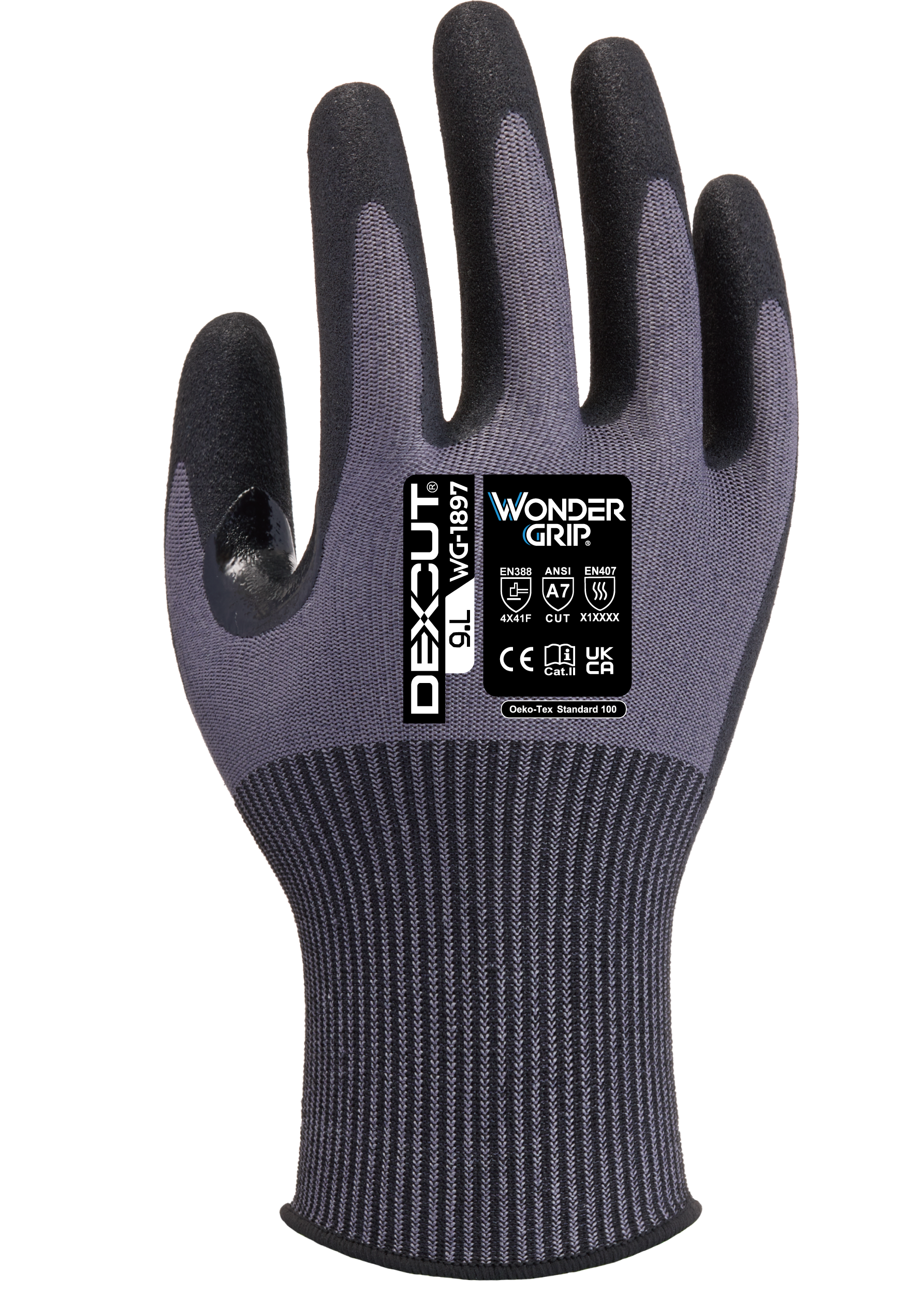 De Wonder Grip® WG-1897 DEXCUT® is een glasvezelvrije handschoen, ontwikkeld met dezelfde R&D-aanpak als onze 18-gauge-serie en combineert ergonomisch design met geavanceerde vezeltechnologie voor superieure bescherming. Gecertificeerd volgens ISO 13997 niveau F en ANSI/ISEA 105 niveau A7 snijweerstand, voldoet deze handschoen aan de zwaarste eisen. De ultradunne voering combineert hoogwaardige snijbestendige vezels met ergonomische vormgeving, wat zorgt voor een hoog draagcomfort. Afgewerkt met een Wonder Grip Performance™ nitrilcoating biedt de WG-1897 een veilige grip in droge, licht olieachtige en vettige omstandigheden, waardoor u de hele dag zelfverzekerd, nauwkeurig en efficiënt kunt werken.