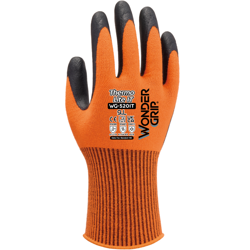 De Wonder Grip® WG-520 Thermo Lite IT is een handschoen met enkele nitrilcoating op een 13-gauge geborsteld acryl en spandex voering. Acryl biedt extra isolatie voor bescherming tegen koude, terwijl spandex helpt om flexibiliteit, pasvorm en comfort te behouden. WG-520 Thermo Lite IT is de handschoen bij uitstek voor gebruikers die op zoek zijn naar de beste pasvorm, behendigheid en comfort terwijl ze hun handen warm houden.