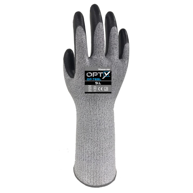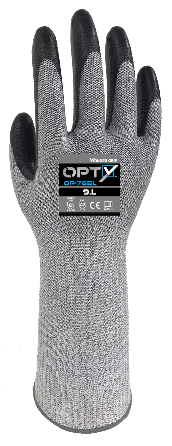 Wonder Grip® OP-765 Opty™ er den perfekte hansken for brukere som er ute etter en løsning som kombinerer kuttbestandighet (ISO13997 nivå B og ANSI A2) og god fingertuppfølsomhet. Brukerens hender er godt beskyttet takket være det lange skaftet (30cm).