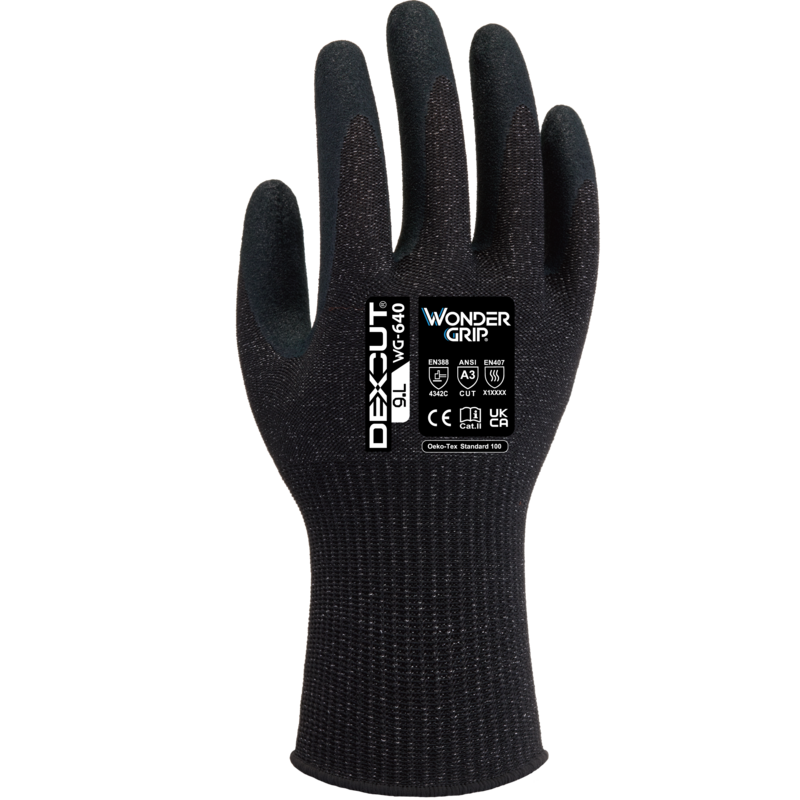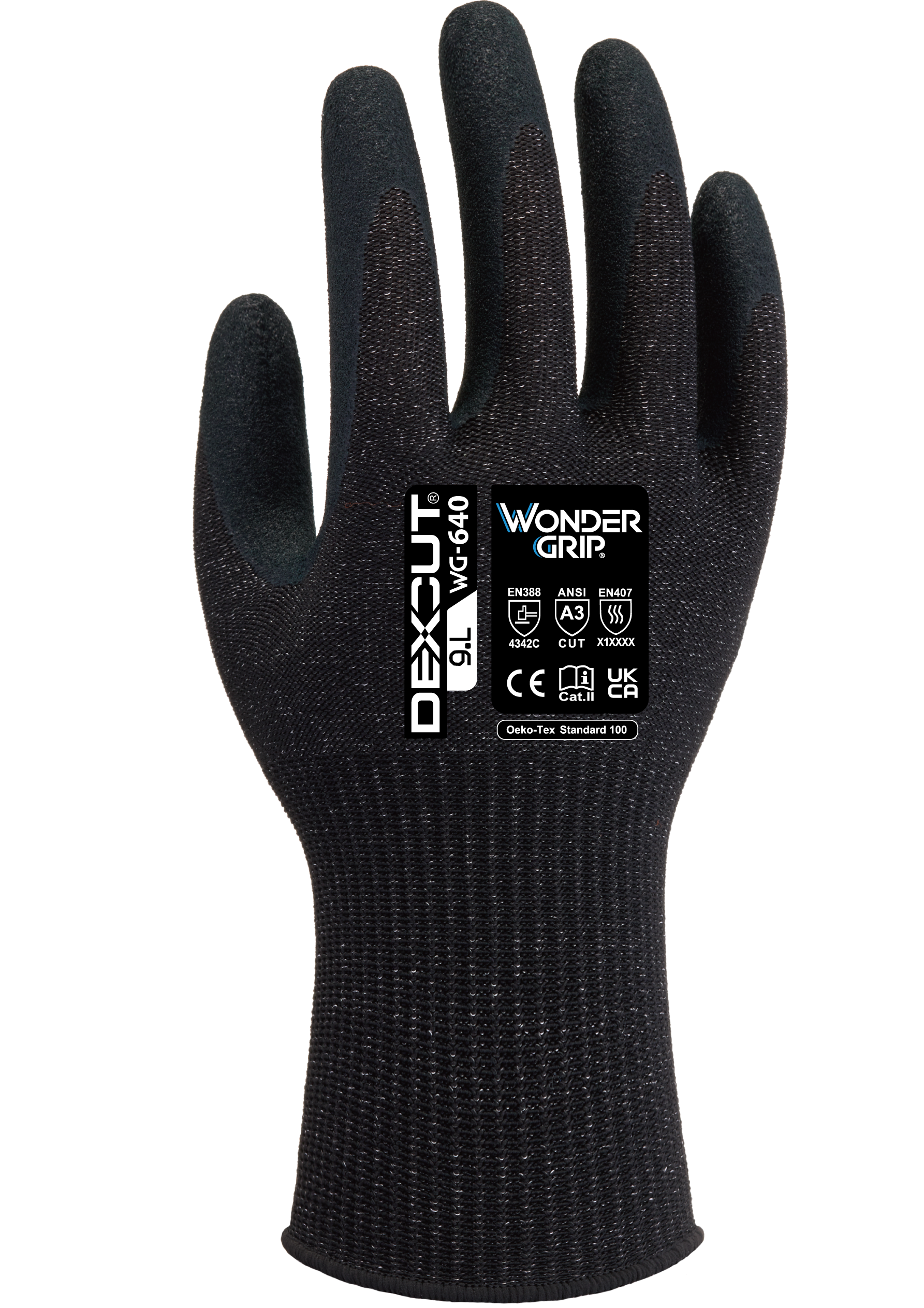 WG-640 Dexcut® сочетает в себе нашу фирменную гибкость, ловкость захвата и сцепление, а также отличную стойкость к порезам (ISO 13997, класс C). WG-640 Dexcut®, разработанная с использованием запатентованной высокоэффективной смеси армированного нейлона и минерального волокна, является идеальной перчаткой для работ, где требуется устойчивость к порезам среднего уровня в сухих, влажных и масляных средах.