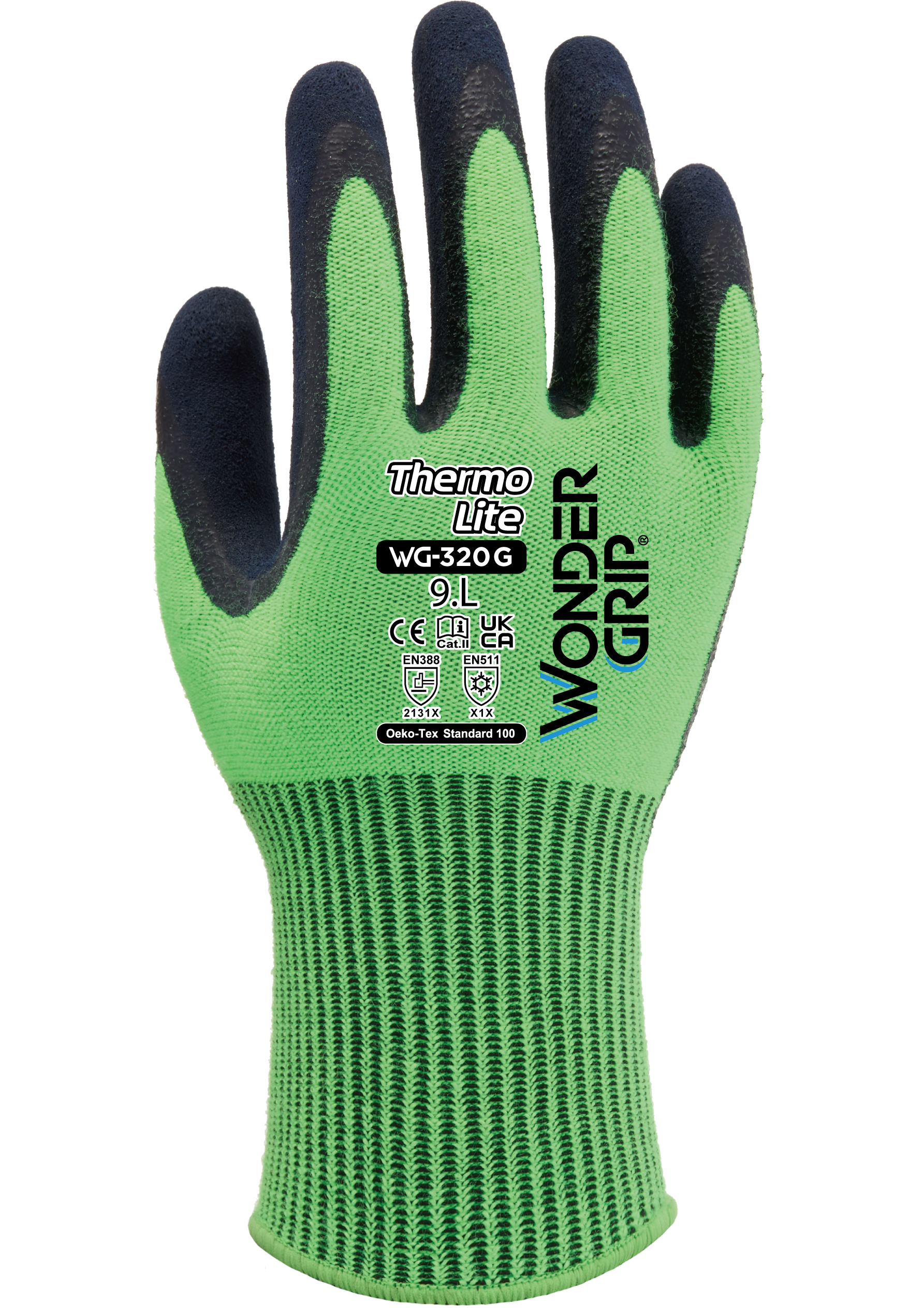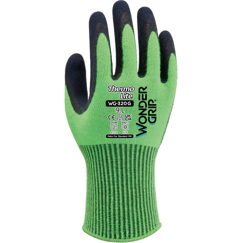 Wonder Grip® WG-320G Thermo Lite — это перчатки с двойным латексным покрытием на подкладке из акрила с начесом и спандекса 13 класса вязки. Акрил обеспечивает дополнительную изоляцию для защиты от холода, а спандекс способствует поддержанию эластичности, удобной посадки и комфорта. WG-320G Thermo Lite — это лучший выбор для тех, кому в перчатках важны оптимальная посадка, удобство движений, комфорт и при этом теплые руки. Теперь в зеленом цвете повышенной видимости для большей заметности и безопасности рук.