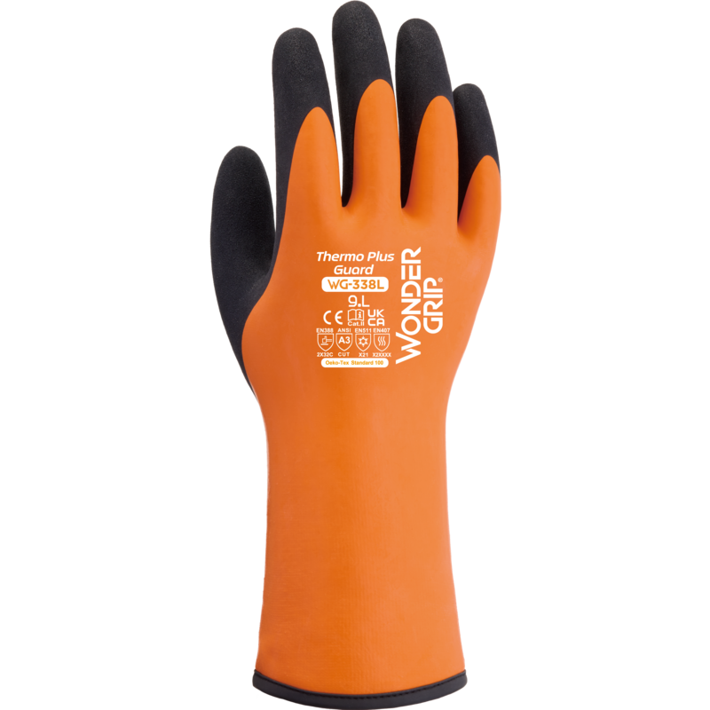 Wonder Grip® WG-338L Thermo Plus Guard är en 30 cm lång handske med dubbel gummibeläggning, mästerligt utformad på en liner av 13-gauge akryl. Wonder Grip Technology™-beläggningen ger perfekt grepp och motståndskraft i torra såväl som våta förhållanden. Wonder Grip® WG-338L Thermo Plus Guard är utformad med både köldbeständighet och fullständig vattentäthet i åtanke. Den är det perfekta valet för utmanande arbetsuppgifter i minusgrader.